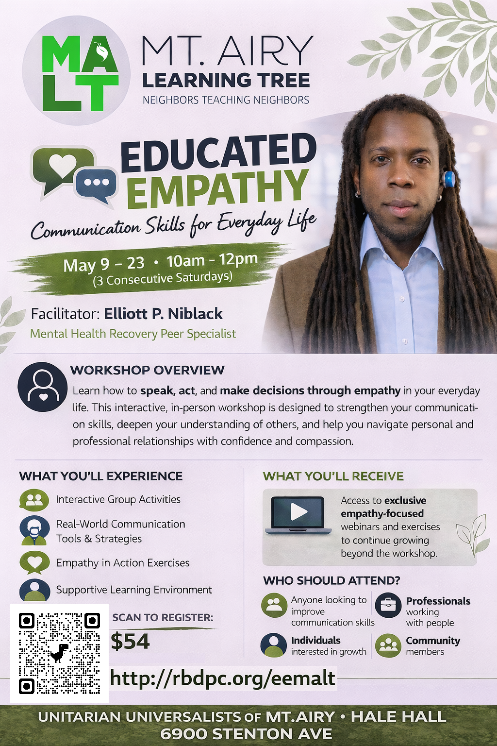 Step into a space designed for meaningful growth, connection, and real-world transformation. Educated Empathy: Communication Skills for Everyday Life is an in-person workshop held over three consecutive Saturdays, offering a structured and immersive experience to strengthen how you communicate, relate, and make decisions. Rather than a one-time session, this series allows you to build skills over time—returning each week with new insights while developing a deeper understanding of how to speak, act, and choose with empathy in everyday situations.